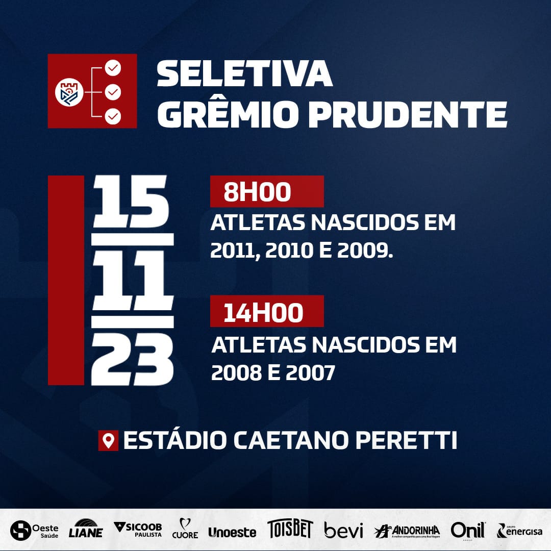 O Grêmio Prudente vai realizar uma seletiva gratuita para reforçar as categorias de base em 2024.